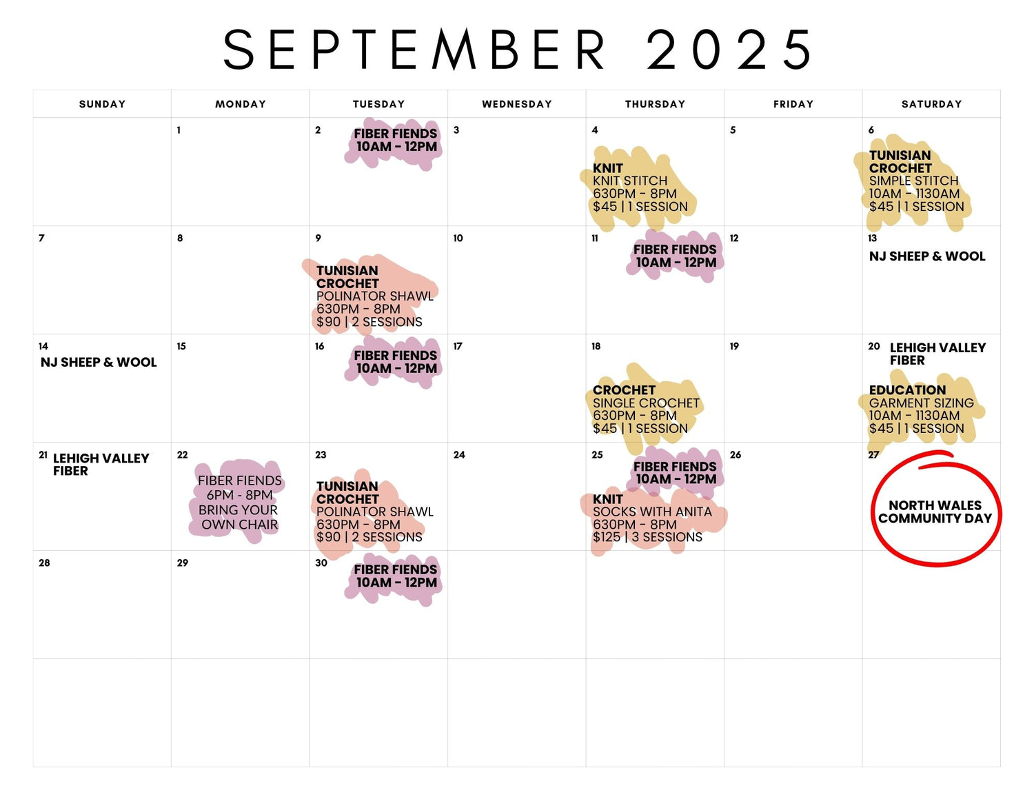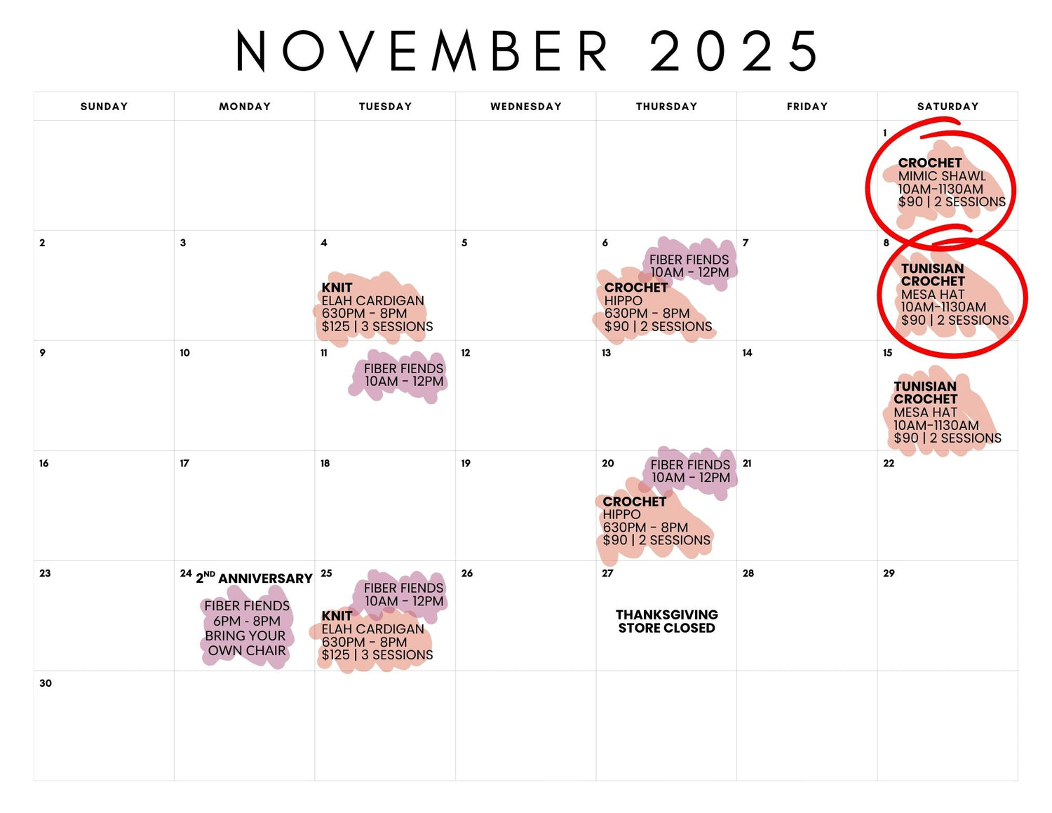 π Dive into the heart of Ewenited Stitches with our calendar page. It's your go-to spot for tracking when we're available to help you out with anything technical, hosting cozy fiber group meet-ups, and listing all our scheduled classes. Everything you need is right here β can't wait to see you at one of our gatherings!β¨